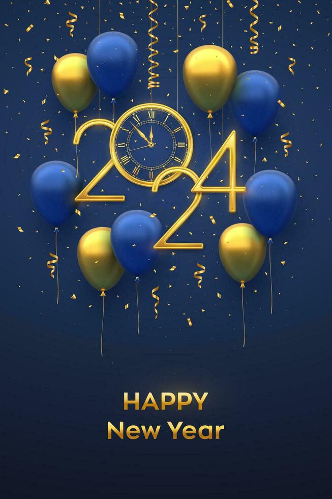 Happy New 2024 Year. Hanging Golden metallic numbers 2024, watch